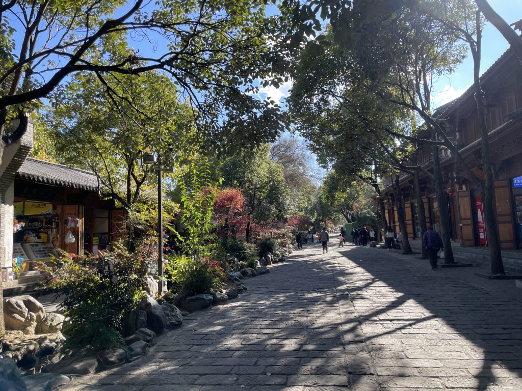 Ein wirkliches Dorf ist Shaxi nicht. Es gibt eine Altstadt mit Fußgängerzone, und auch hier reiht sich Shop an Shop, und Guides schwenken ihre Fähnchen. Friedlicher ist es trotzdem. Die Straßen sind von grünen Bäumen gesäumt, Wasser plätschert in kleinen Kanälen über Stufen, enge Seitenstraßen schnörkeln sich in die Umgebung. Abends strahlen die alten Holzhäuser in einem warmen Licht.