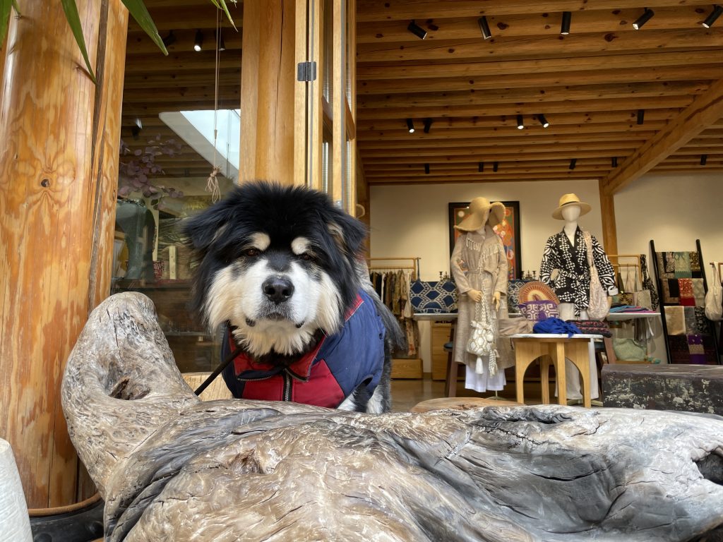 Bunte, kreative Cafés mit Dachterrasse gibt es auch. Unten: Flauschiger Hund und Blick von der Terrasse unseres Hotels.